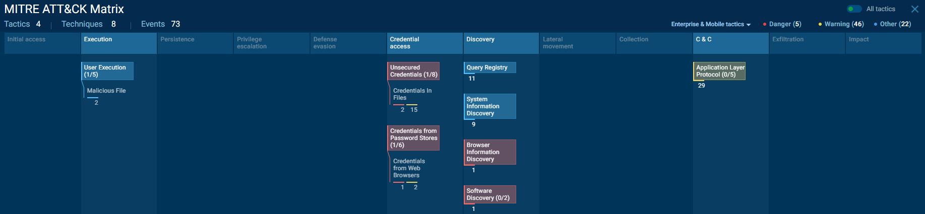 Podemos ver la matriz de Mitre sobre las técnicas utilizadas por el malware y vemos que encaja en concreto con lo que estamos analziando, acceso a credenciales, descubrimiento, consultas de registro.