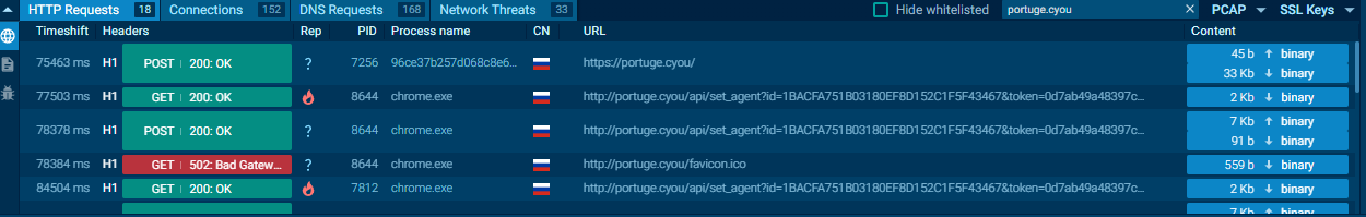 Analizando el tráfico podemos ver llamadas a dominios que ya han sido categorizados como maliciosos pero que podrían llamarnos la atención en un análisis inicial.