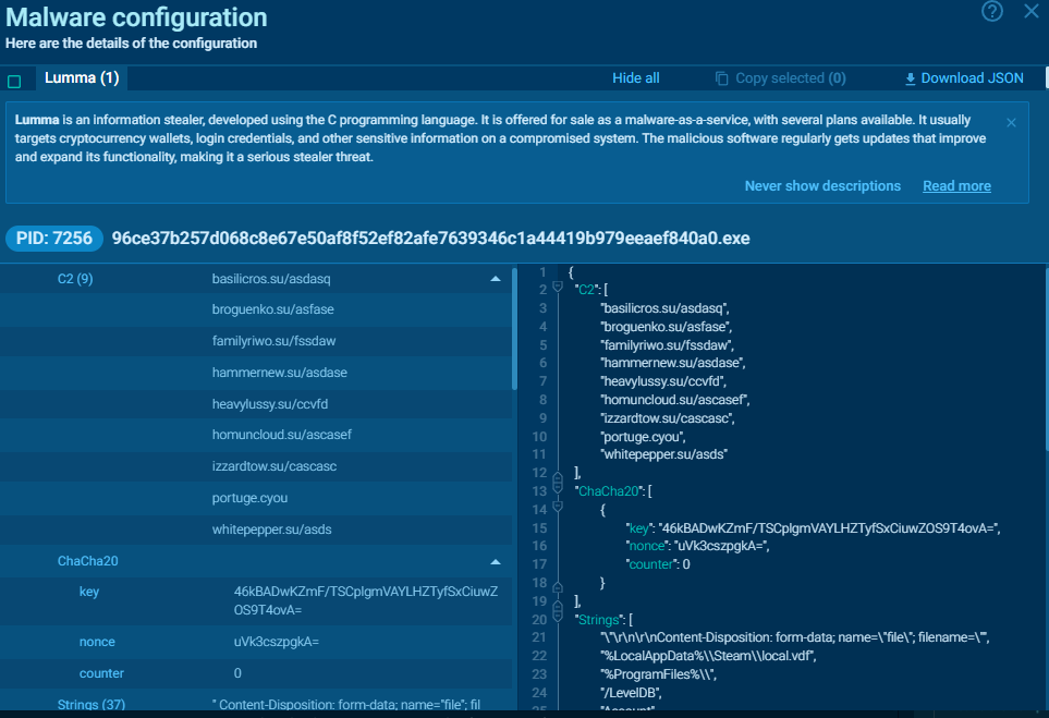 También mediante el apartado MalwareConf al ser un software ya analizado el propio Any Run nos proporciona configuración del Lumma con los diferentes C2 a los que podría llamar. Tener varios dominios apuntando a uno o múltiples C2 es importante normalmente ya que permite hacer el malware resiliente y que si pierdes un C2 o lo banean puedas seguir operando. En este punto podemos ver de hecho dominios a los que no se ha llamado por parte del Lumma pero que podría hacerlo.