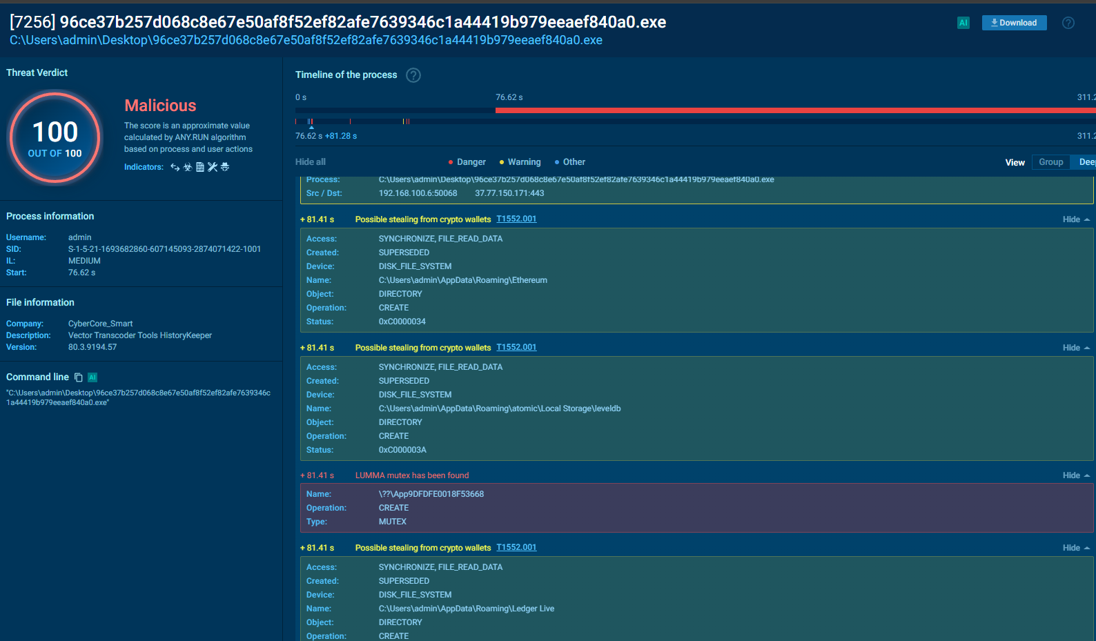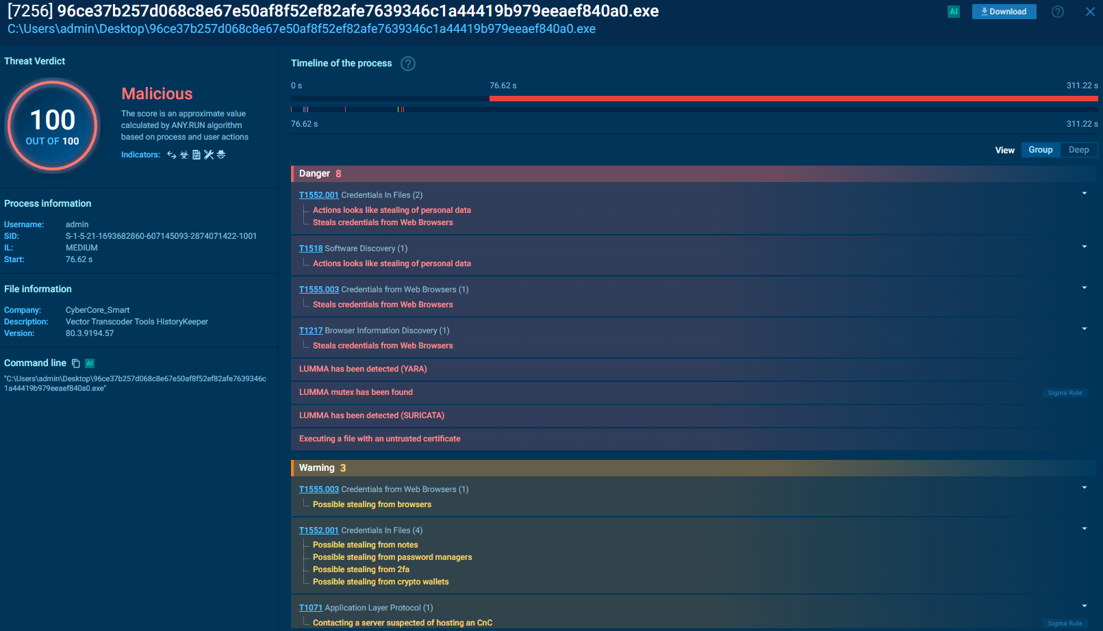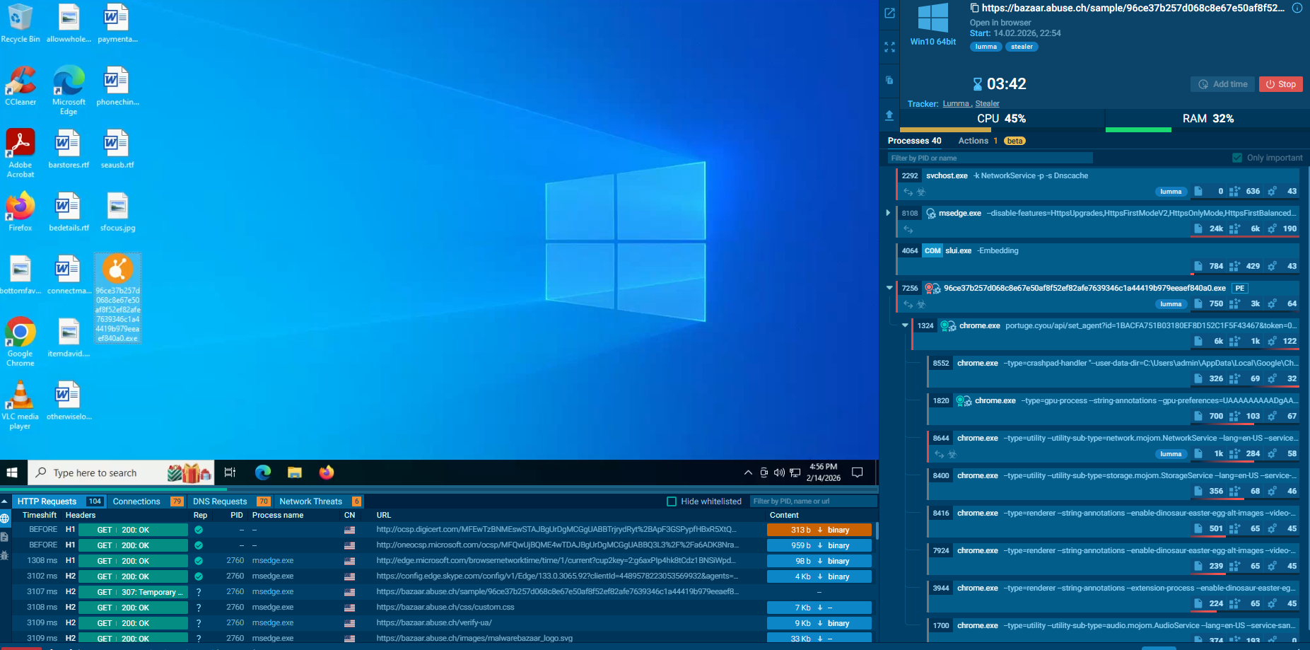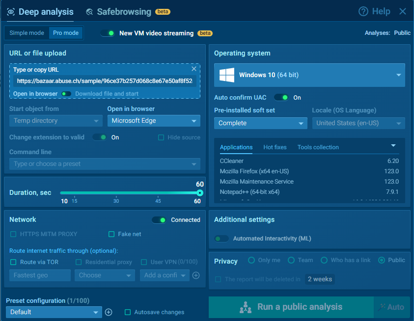 Para poder explicar un poco su funcionamiento y visualizarlo debemos de visualizar también el comportamiento de un malware complejo. Es por ello que vamos a exponer un poco lo que es una Sandbox. Una Sandbox es básicamente una máquian virtual para analisis de malware la cual incluye un montón de funcionalidades preparadas para analizar comportamientos maliciosos. Personalmente suelo usar Any Run para realizar pruebas o simplemente estudiar, aunque hay que tener en cuenta que con la versión community hay bastantes limitaciones, entre ellas una a nivel de OPSEC que es la inteligencia compartida que viene de todo lo que subas. Lo que subas es público salvo que pagues para que no lo sea, y nadie te asegura que ellos no lo utilicen por muy provado que sea, por lo que mucho cuidado con lo que subes. En mi caso vamos a usar una muestra de Lumma Stealer obtenida a través de Malware Bazaar para analizar su comportamiento en la sandbox.