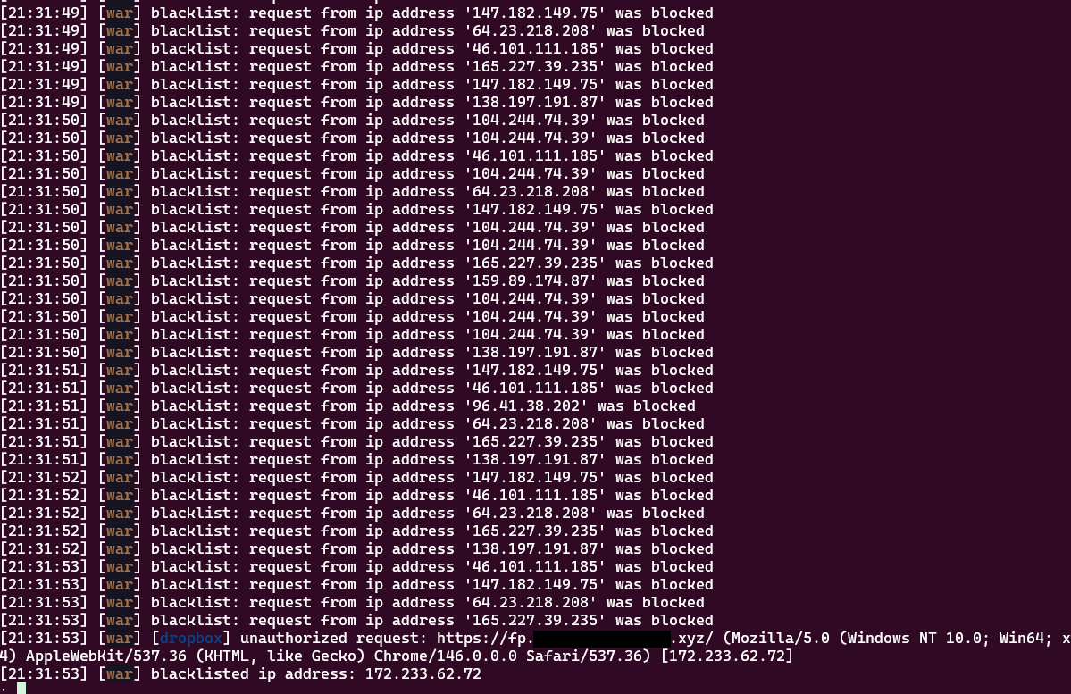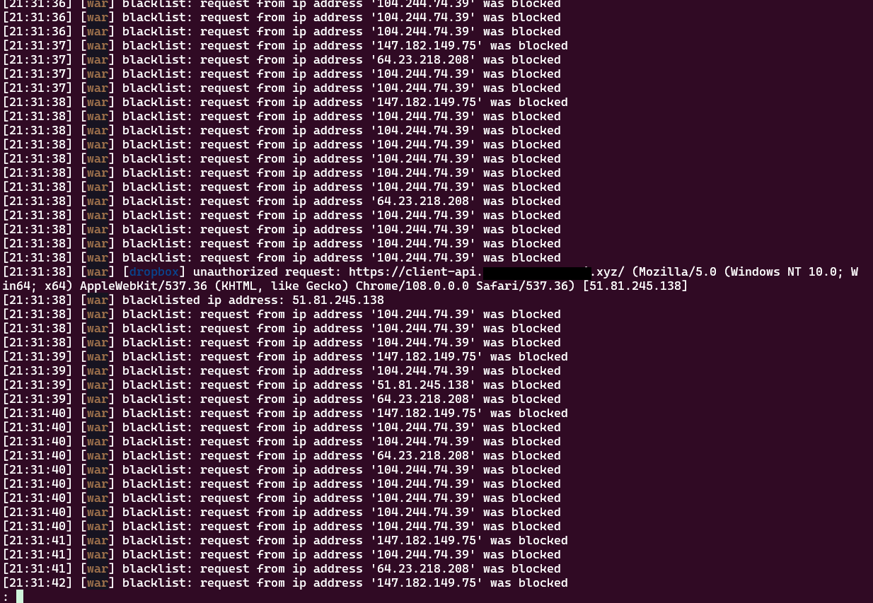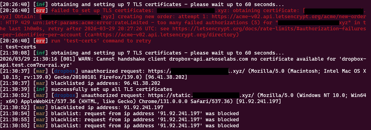 Y muchas muchas más peticiones… Os diría que esto para en algún momento, pero creo que es mejor que seaís conscientes del volumen de tráfico que vaís a recibir y que no va a parar. Por lo menos Evilginx te automatiza parte de la blacklist que verás más abajo. Quiero aclarar que el phishlet todavía ni siquiera funciona, simplemente he conseguido el certificado de Let´s Encrypt.