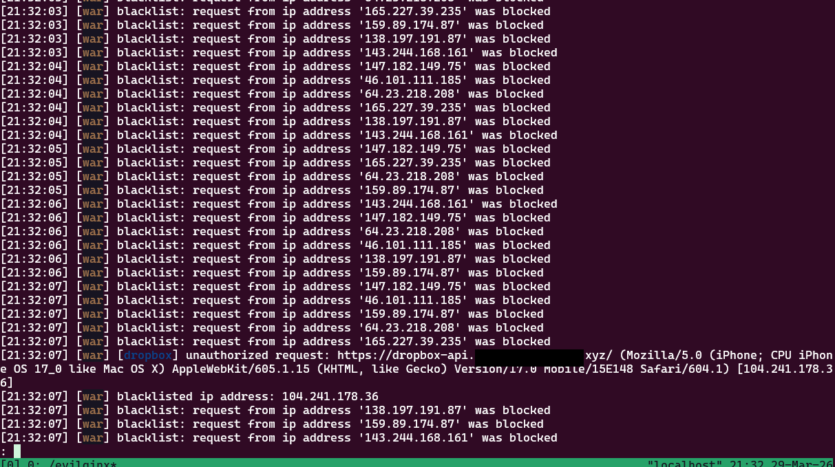 La blacklist se almacenará en /root/.evilginx/blacklist.txt con las IPs que detectes. Lo suyo sería tener una lista con los rangos e ips que vayas detectando que están monitorizando comportamientos maliciosos. Creo que es obvio, pero no voy a proporcionar un listado así, si sabes lo que haces sabrás generarlo.