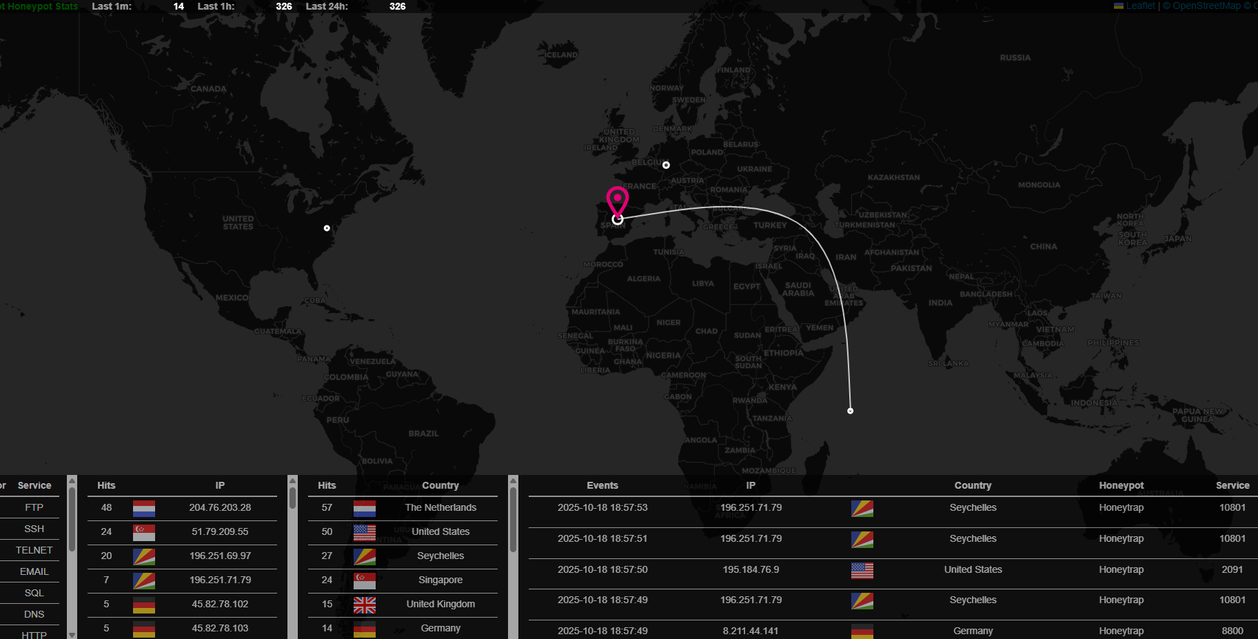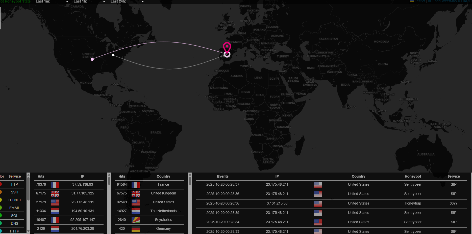 Lo primero de todo el attack map, en el que tenemos un mapa en tiempo real de peticiones por paises categorizando muchos servicios. Es curioso porque lo vereís en otro apartados pero si montas el Honeypot en España, Alemania, EEUU o donde sea y si es en diferentes servicios (un ovh, linode, AWS…) pues el resultado es diferente en algunas IPs. Es verdad que hay escaneres masivos que coinciden pero es curioso investigarlo. Todo lo que verás en este mapa son peticiones en tiempo real, la mayoría de ellas maliciosas y otras de escaneres de inteligencia, iremos más tarde a ello.