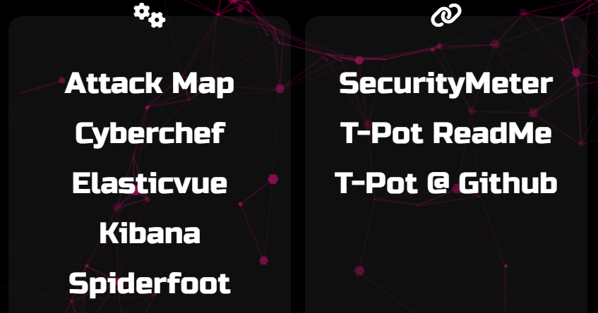 Luego tendrás una instancia de CyberChef que te podrá ayudar a funcionar. Es el mismo que en el que usas online del repositorio . También tendrás una instancia de ElasticVue por si te fuese necesario dadas las configuraciones posibles de t-pot. También tendrás una instancia de SpiderFoot desplegada en tu servidor para poder realizar consultas OSINT sobre la información que estés recibiendo.