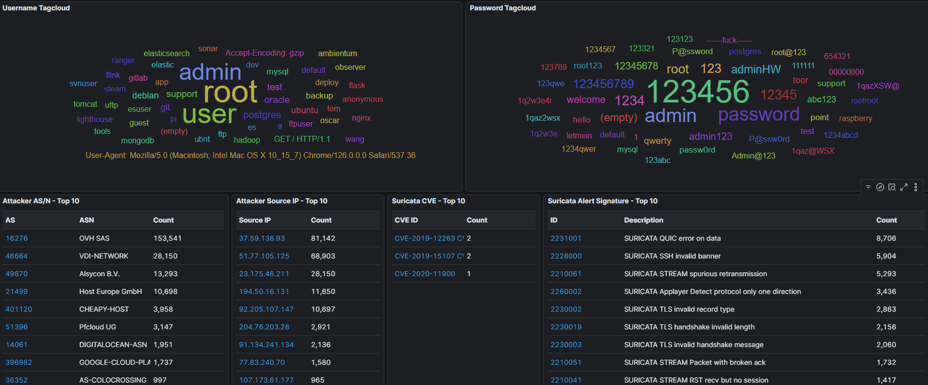 Ya con Kibana podemos sentarnos a analizar cada uno de los servicios que tenemos expuestos. Tenemos muchisimos Honeypots y logicamente dependiendo de los scaneres y el tiempo tendremos resultados diferentes. Podemos sacar mucha información pero tened en cuenta que dejarle tiempo para que lso escaneres masivos que se lanzan en momentos puntuales toquen y podais sacar esa info puede ser interesante. Por ejemplo si alguien se dedica a escanear servicios SSH todos los martes y pones el honeypot un jueves pues bueno, no lo pillarás. Ya depende un poco del uso que le quieras dar al honeypot y que objetivos tienes. Puede ser útil para bloquear escaneres masivos vaya. El honeypot de SentryPeer es el que más detecciones ha tenido en mi caso.
