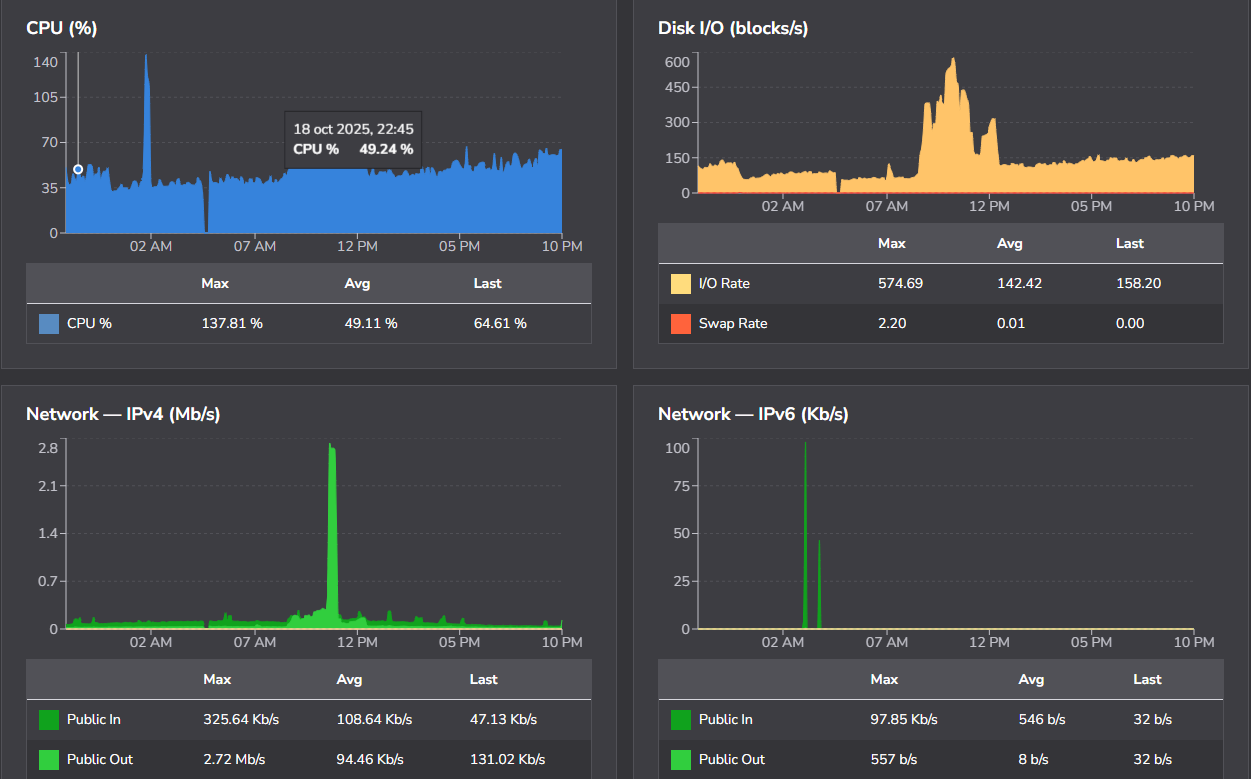 Ya lo he montado un par de veces y en todas he tenido problemas. Esta vez no me han tirado el servicio (tampoco lo he dejado muchos dias funcionando) pero como veís hay picos evidentes con muchísima carga y subiendo la CPU mucho. La caida que aparece es un reinicio creo realizado por mi, pero tened mucho cuidado con esto. Aclarar que es un servidor que cumple de sobra specs son 6 cores, 16GB y 320GBs… No es un tema de recursos.