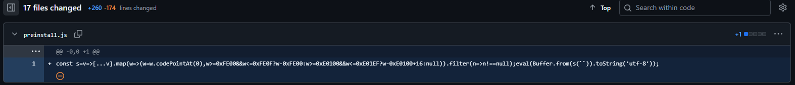 Básicamente el malware se replicó por una Pull Request de otro usuario en su repositorio que había sido infectado previamente. La Pull Request maliciosa introducía un ficherito llamado “preinstall.js” .
