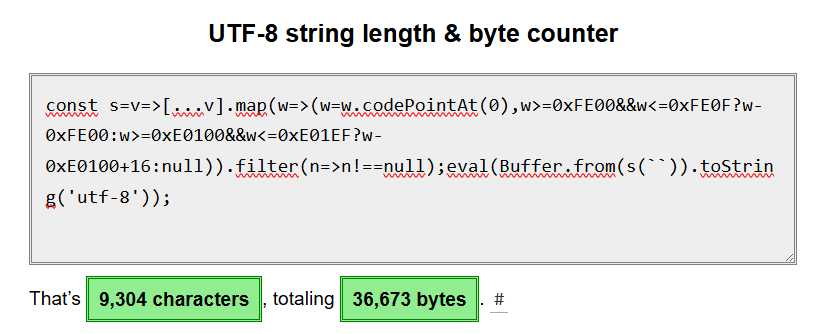 Dándole una vuelta podemos observar que es un método de ofuscación que oculta el contenido de un payload en una cadena de emojis especiales y lo ejecuta usando eval. Podemos ver que existe una discrepancia entre bytes y caracteres usando un byte counter como hace el propio Midu.