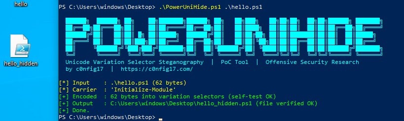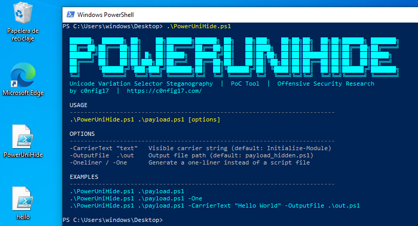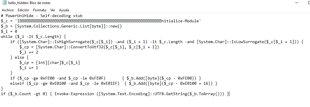 Como medida de OPSEC es útil usar la esteganografía para ocultar el contenido de lo que vamos a ejecutar. Esto puede ser útil en diversos contextos para un red team, por lo que vamos a replicarlo. Para replicarlo, en este caso en Powershell, vamos a usar una herramienta creada por mi (y por Claude, para que engañarnos!) que sirve para reproducir los pasos que hemos visto parcialment (no porporcionaré en el script la rutina de descifrado o cifrado, solo la ocultación por Unicode).