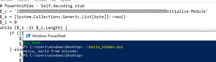 Vamos al lío! Puedes consultar en mi repo PowerUniHide el cual te permitirá de manera sencilla pasarle un payload concreto o un script y devolverte la ofuscasción del mismo con esta técnica. Para poner en práctica todo esto nos descargaremos el script de powershell y lo ejecutaremos.