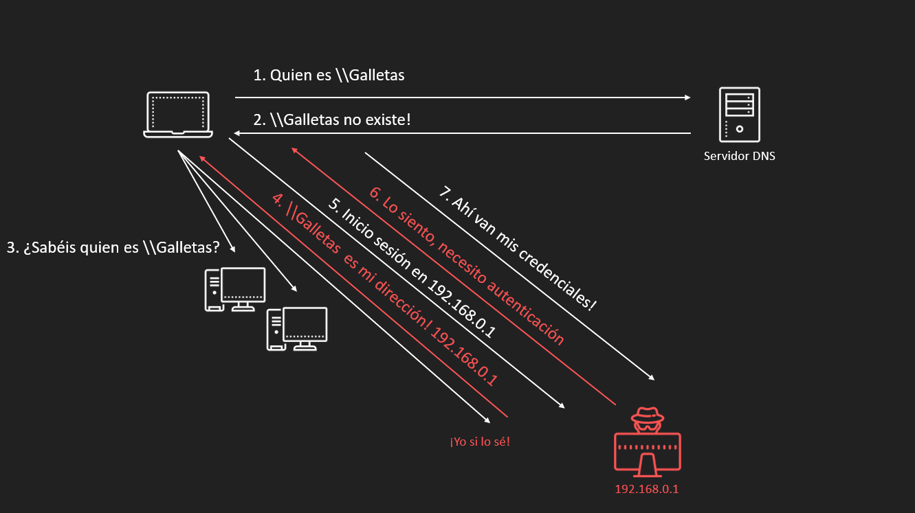 El protocolo LLMNR (Link-Local Multicast Name Resolution) es un protocolo de Microsoft: creado para resolver nombres de equipos de una misma red cuando no hay un servidor DNS disponible. Por diseño el protocolo lo que ayuda es a que un equipo, tras consultar al DNS y no encontrar el equipo que encuentra, preguntar a todos los equipos de la red para tratar de encontrarlo. Este protocolo era antes muy utilizado en infrastructuras pequeñas o que ya tienen unos años. Un ordenador legitimo buscará esa información, si decimos que tenemos esa información tratará de autenticarse contra nosotros y ahí podremos obtener el hash de sus credenciales.